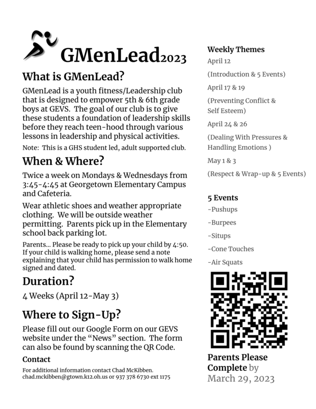 G-MENLEAD2023 registration is now available for 5th and 6th-grade boys at GEVS! Our season will kick off on April 12th and run through May 3rd, meeting every Monday and Wednesday after school until 4:35 P.M. If you have any questions, contact Chad McKibben at chad.mckibben@gtown.k12.oh.us. Please register by March 29, 2023, at: https://docs.google.com/forms/d/e/1FAIpQLSffh9nHReA9cnGkHKh3NLsSLZpzSrChzIsFUbgZZWy73nA4Ow/viewform