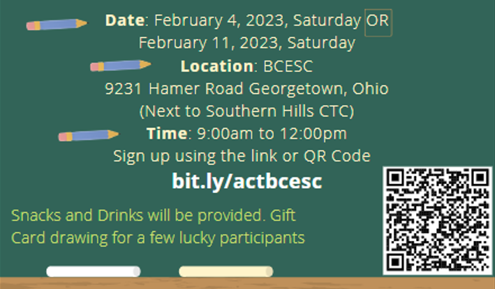 ACT test prep is always in high demand. Here is a free, local opportunity for students in 9th, 10th, or 11th grades. The Brown County ESC will be offering FREE ACT test-taking strategies for any students interested on 2/4/23 and 2/11/23 from 9 am to 12 pm. Register with this link here: http://bit.ly/actbcesc